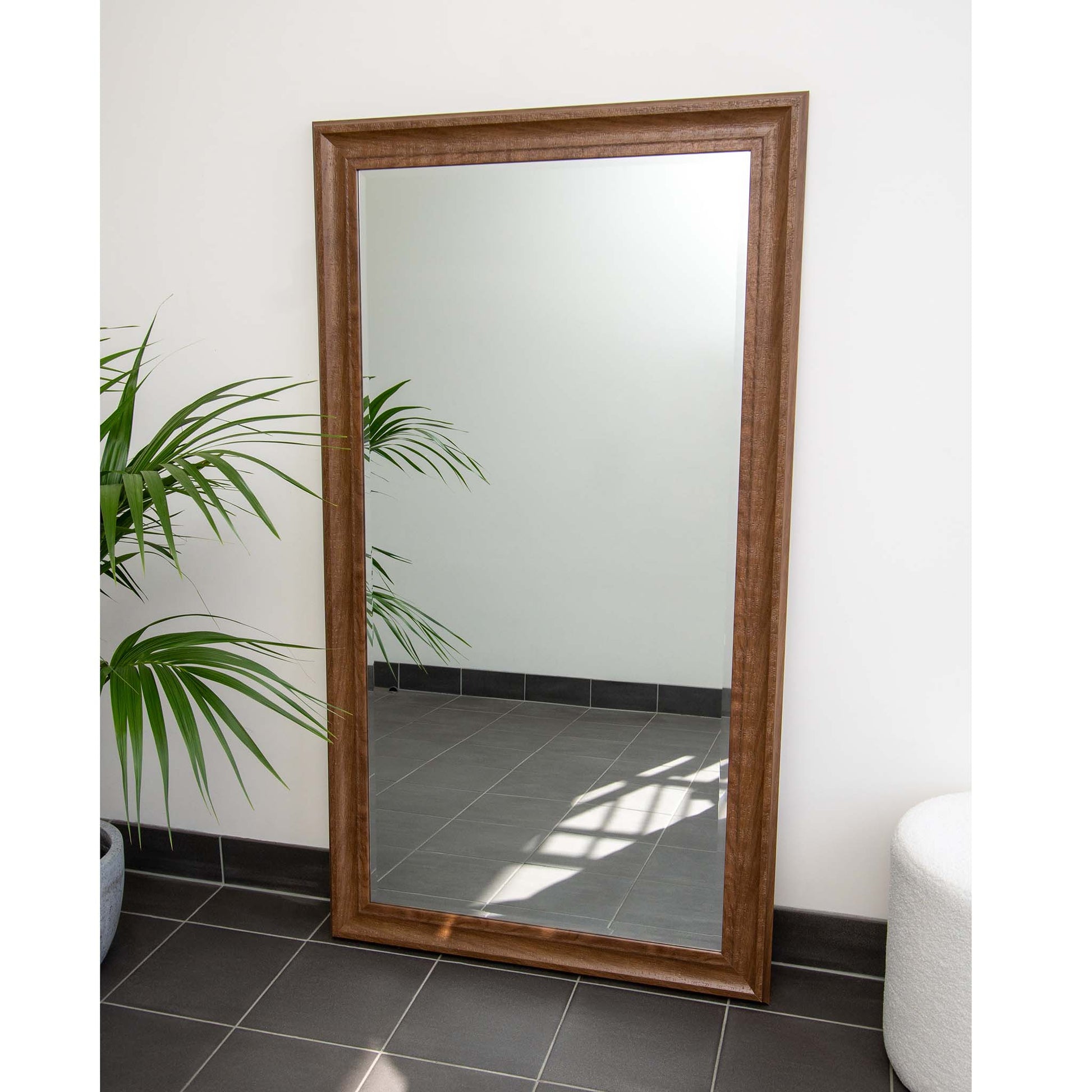 A mirror with a moulded mid-brown wood frame and 1-inch bevel, perfect for adding texture and warmth to your walls.