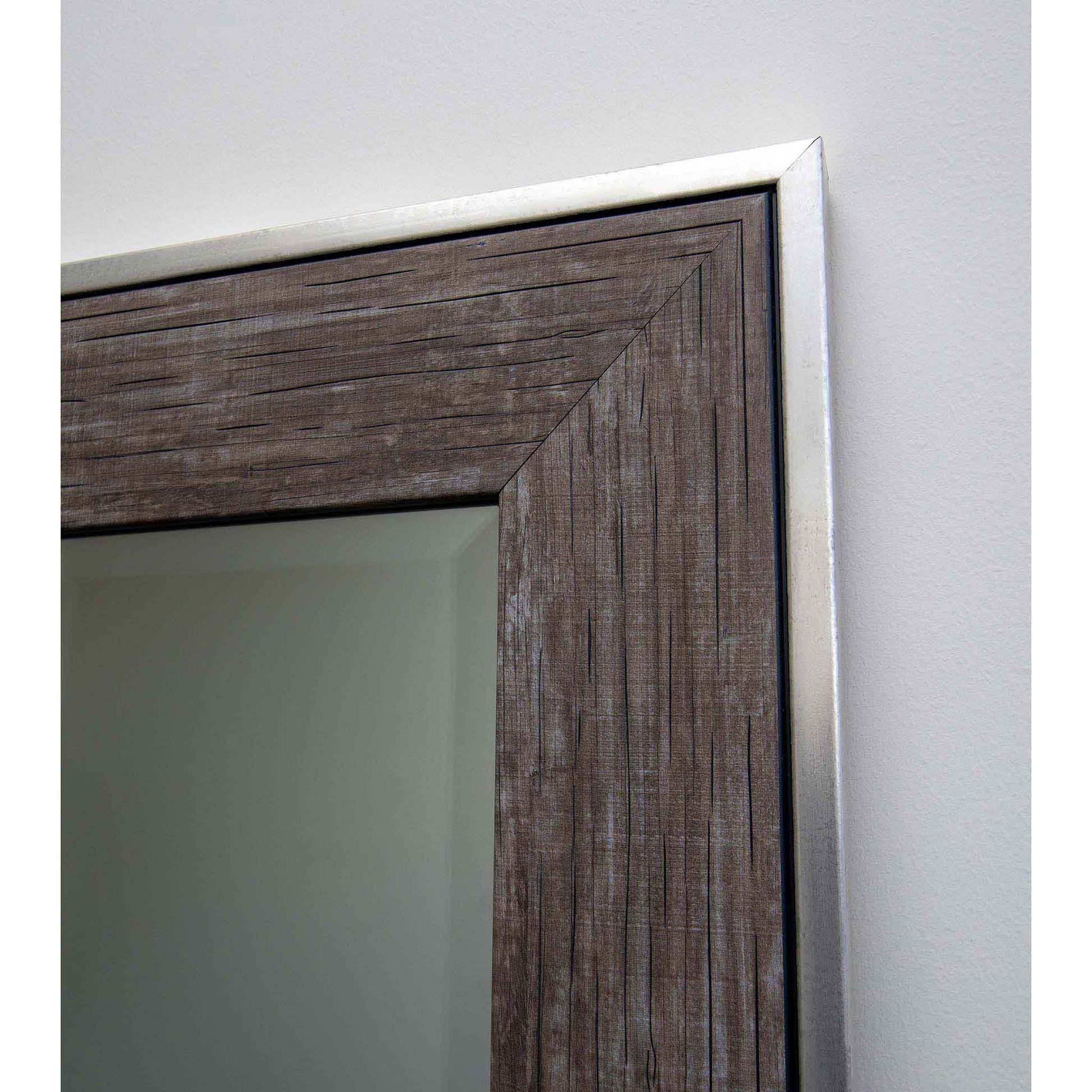 A mirror with a grey wood frame accented by a silver edge and 1-inch bevel, perfect for adding a refined, contemporary touch to your walls.