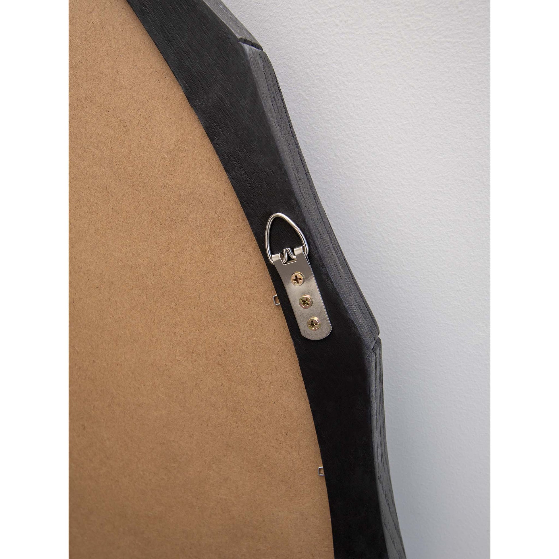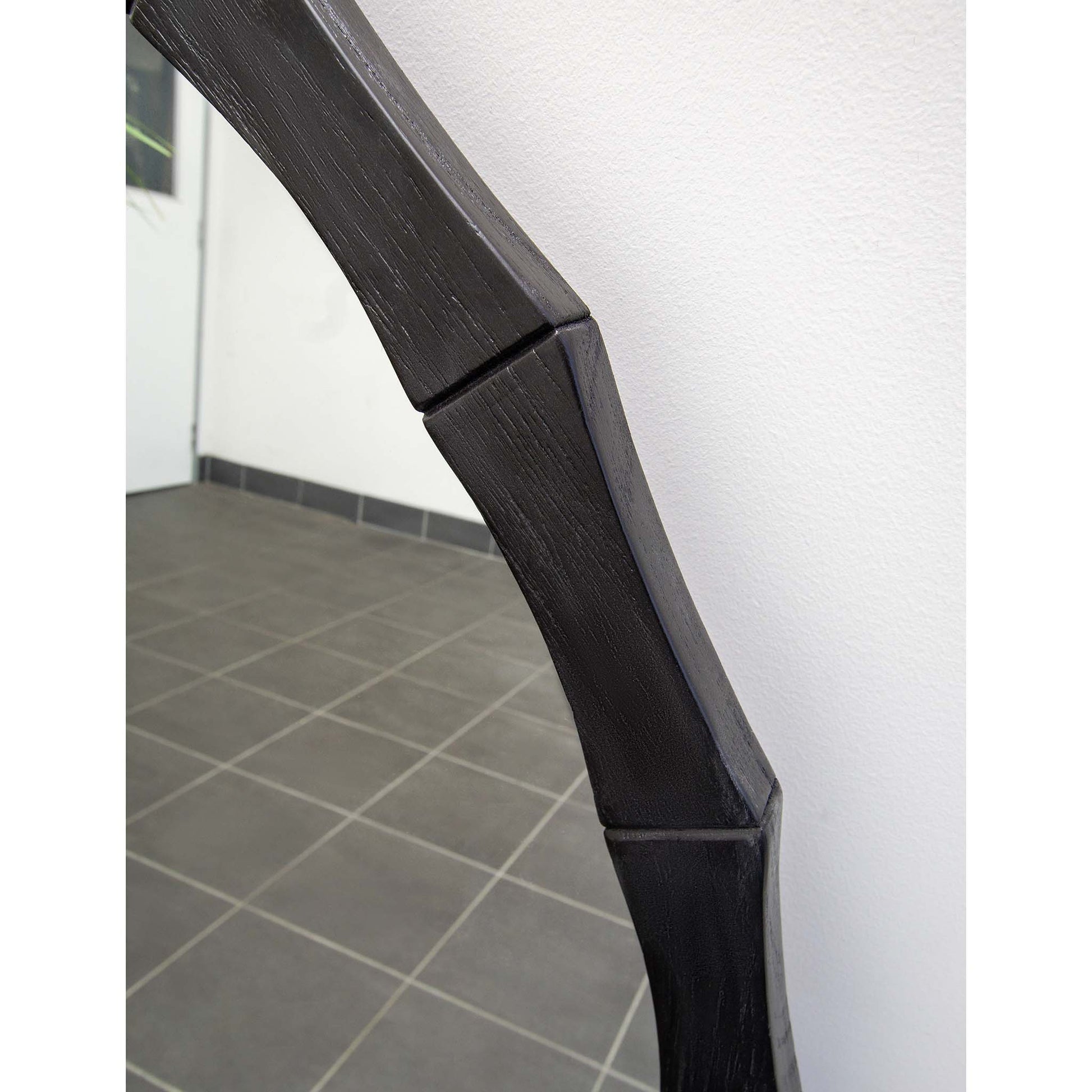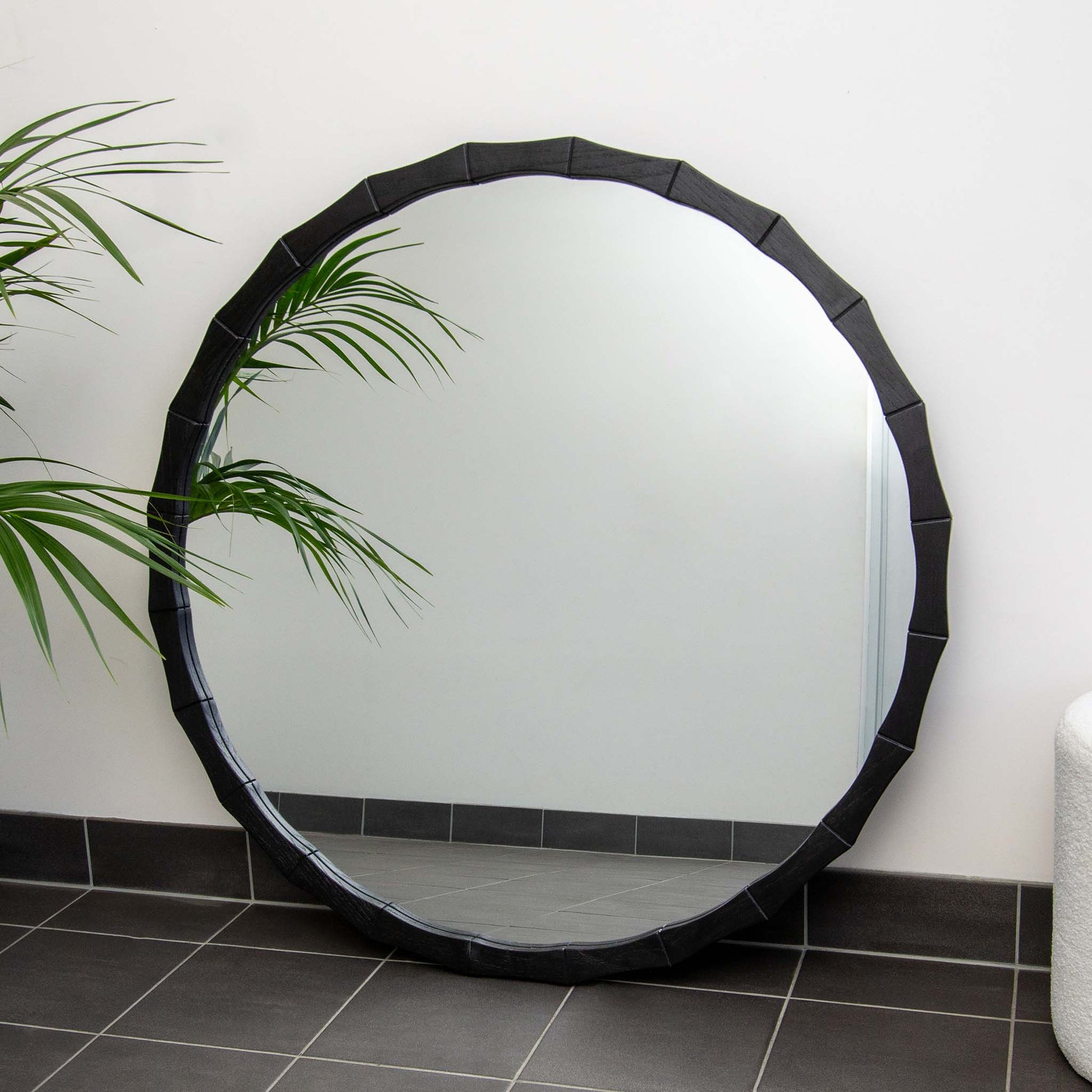 Designed with a bold angular black wooden-style frame, this 120cm round mirror brings clean lines and contemporary style to your walls.
