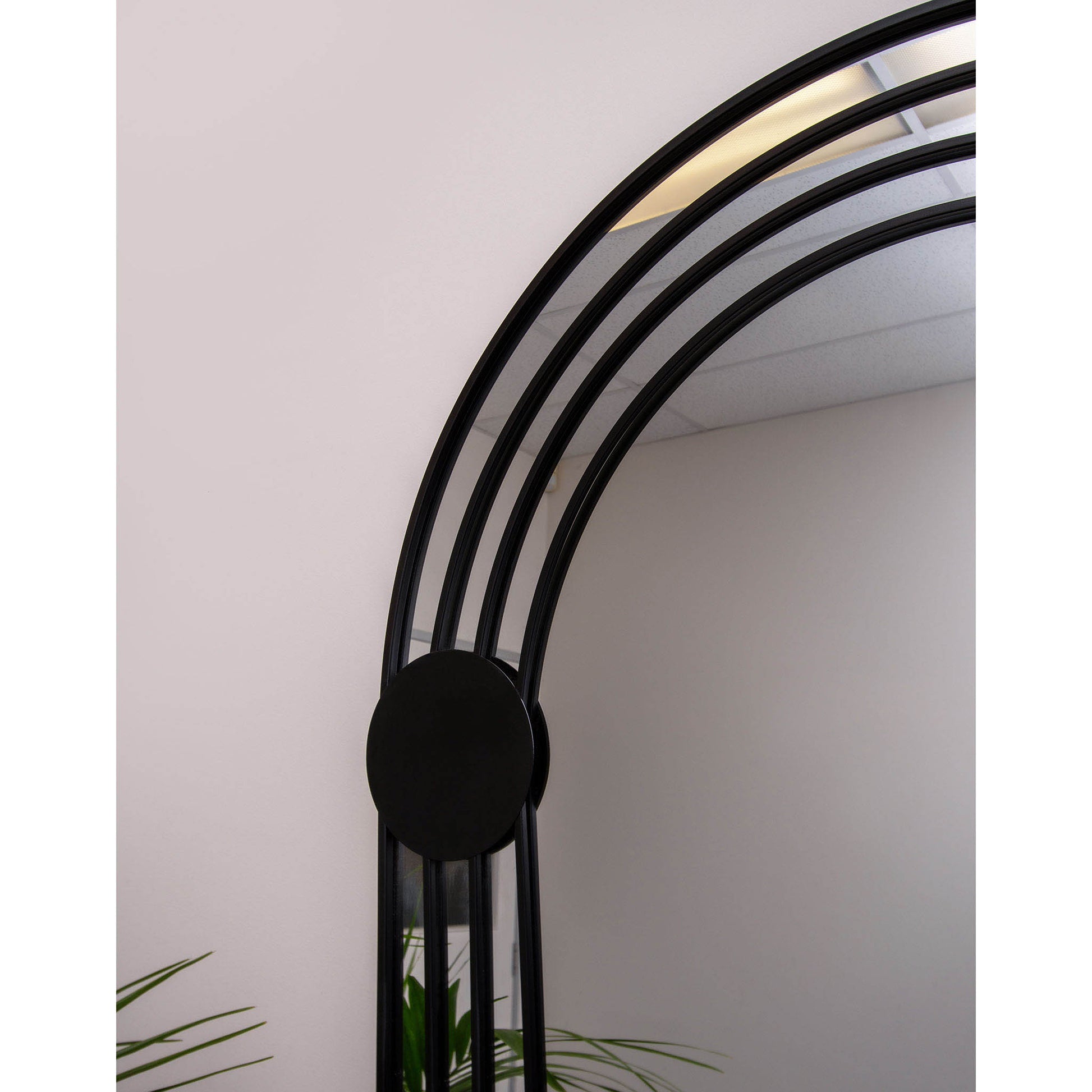This large wall-hang leaner mirror features a deco-inspired arch with a sleek black iron frame. On-trend and striking, it adds style and dimension to any space.