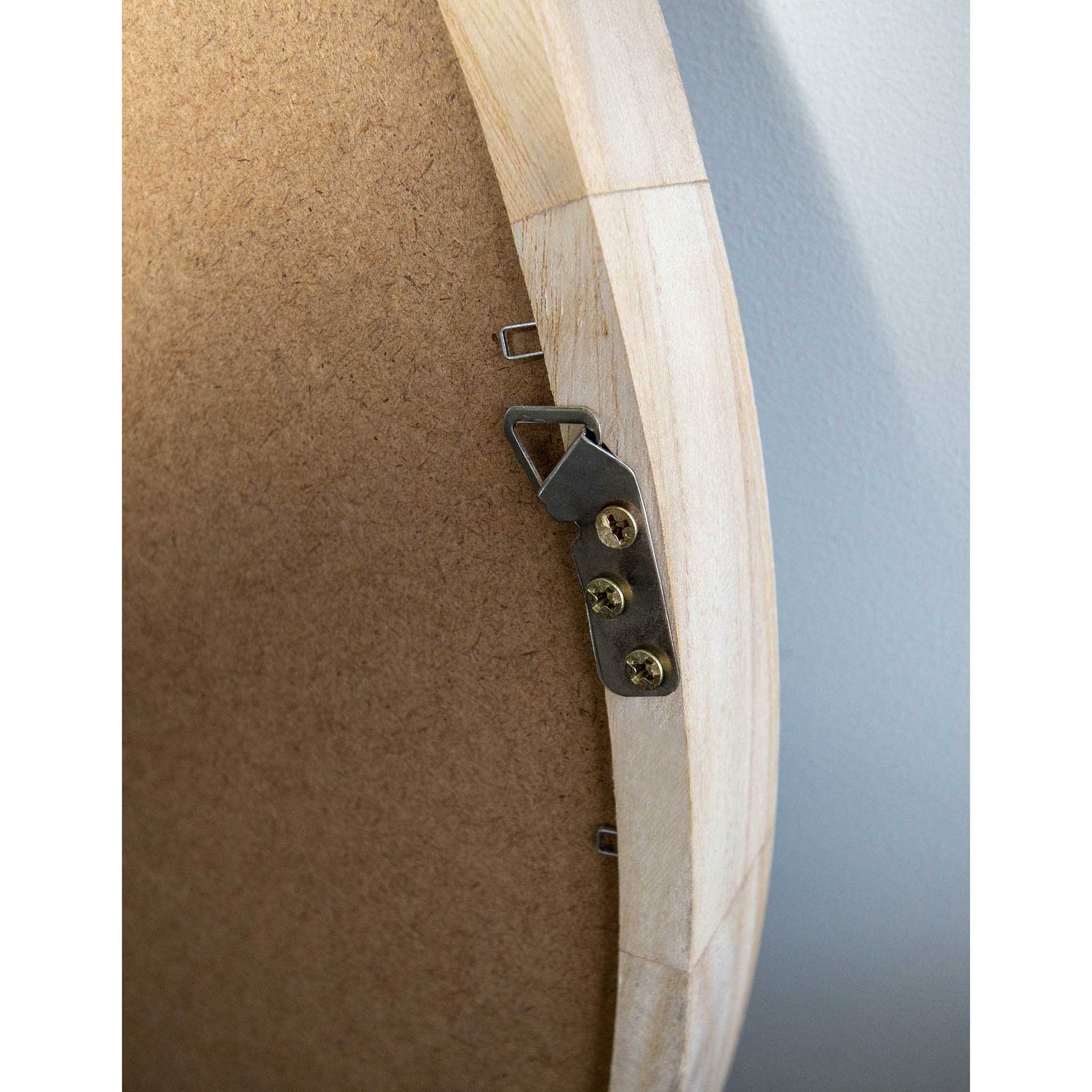 This on-trend round wall mirror features a simple light natural wood frame for a clean, modern look. An easy statement piece for any space.